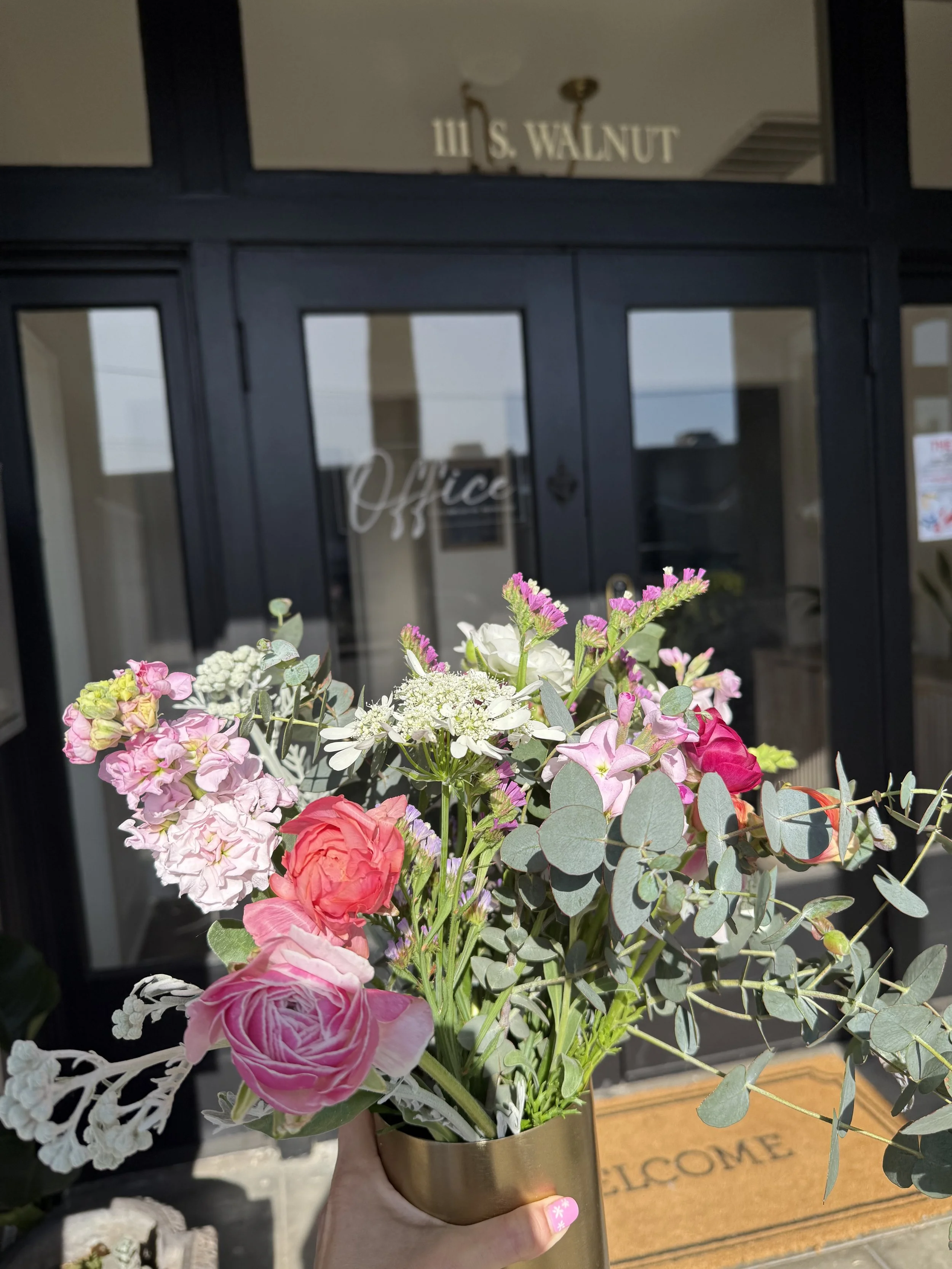 Hand holding a bouquet of pink, white, and green flowers in a gold vase in front of a black door with a "Welcome" mat outside a building with a sign reading "111 S. Walnut".